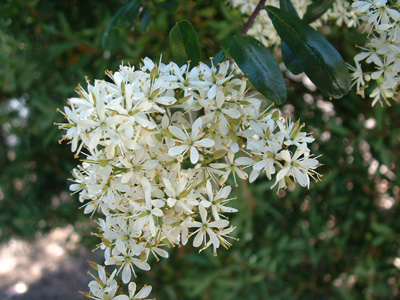 Bushy upright shrub 2.5 – 4.0m height. 2.0 -3.0m width. Evergreen. Growth rate medium. Use for screen, windbreak, paddock shelter. Full sun. Very frost hardy. Extremely drought resistant. Very wind firm. Masses of white flowers late Spring to early Summer. Prune as required – will tolerate a very hard prune . Can be trimmed as a hedge.