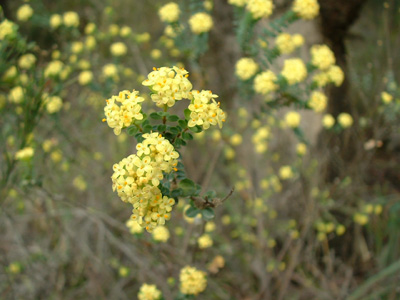 Slender erect shub to 1.0 metres. Leaves turn bright bluish-green when dried. Yellow flowers in spring with yellow bracts persisting.