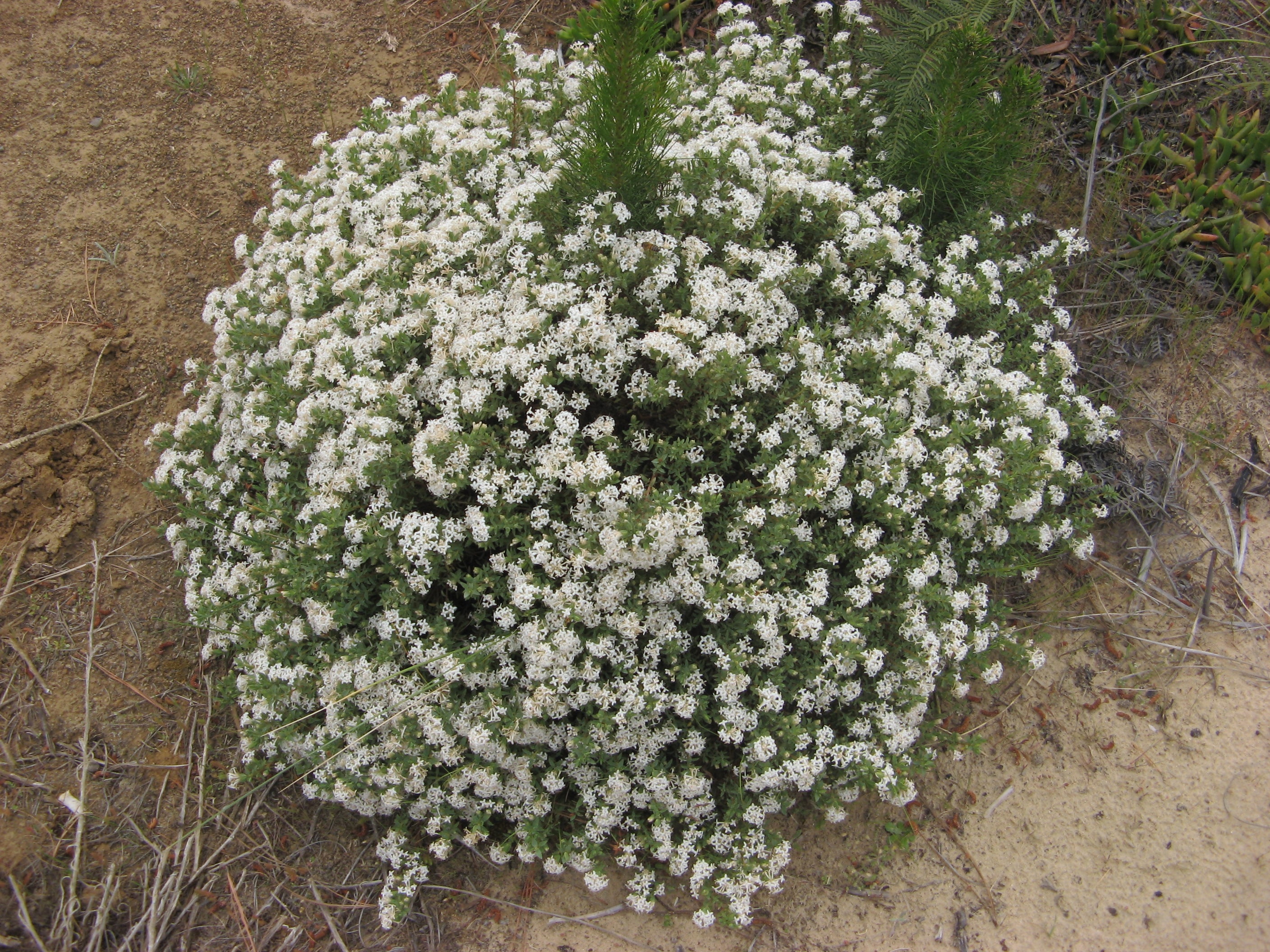 Small shrub 10 to 50 cm. Narrow elliptical leaves. Hairy white flowers in spring/summer.