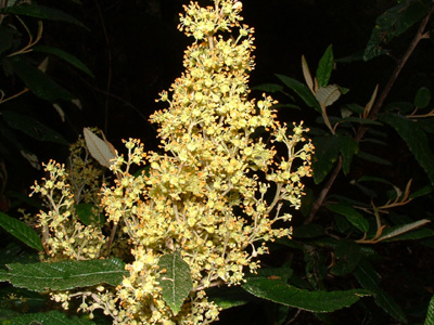 Erect shrub 3.0-4.0m height.Width 1.5-2.0m. Evergreen. Growth rate very fast. Use as screen, filler and specimen. Any soils-wet or dry. Suits creeks and gullies. Full sun to part shade (best). Very frost hardy. Drought tolerant – will suffer but recover. Extremely wind firm. Yellow flowers in Spring. Prune as required for shape.
